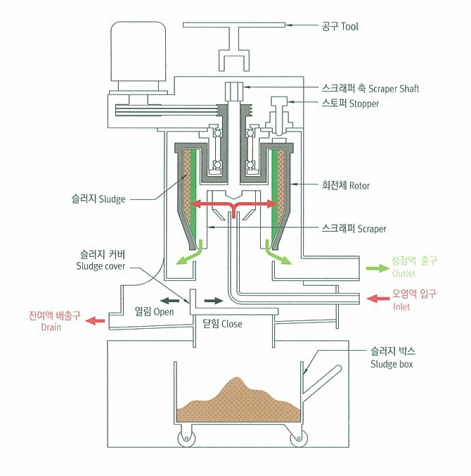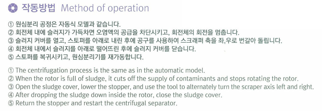 원심분리기 반자동식 NSF-50S / NSF-100S / NSF-200SSemi-Automatic Models 상부의 T형 스패너를 사용해서 슬러지를 제거하므로 슬러지나 투입되는 액체에 대해서 인체 접촉이 전혀 없습니다.