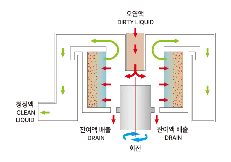 - 미립자가 포함된 오염액은 입구를 통해 회전체로 흘러 들어갑니다.